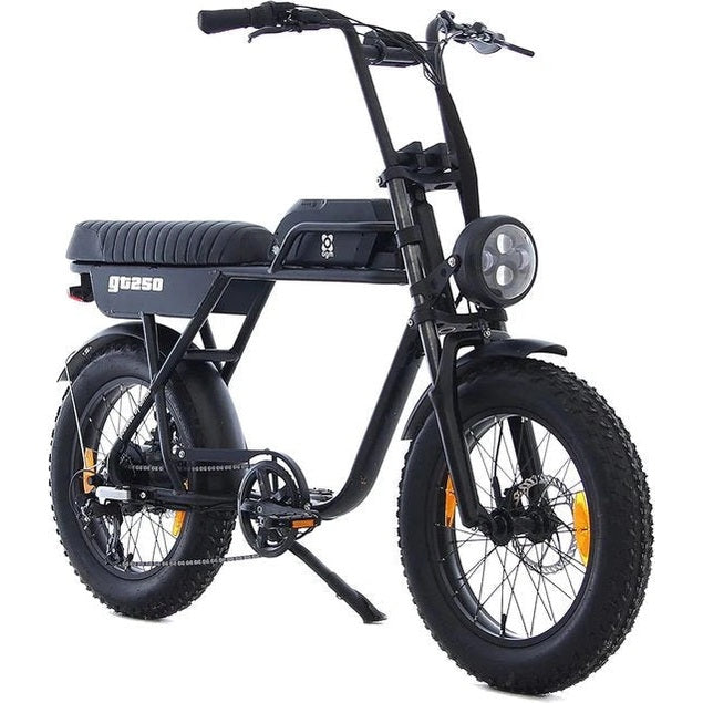 Die AGM GT250 bietet dank ihrer Stollenreifen hervorragenden Grip auf jedem Untergrund und sorgt so für eine stabile und sichere Fahrt. Der lange Retro-Sattel bietet außergewöhnlichen Komfort, ideal für lange Strecken ohne Druckstellen im Sattel. Ausklappbare Fußstützen ermöglichen die Mitnahme eines Beifahrers.