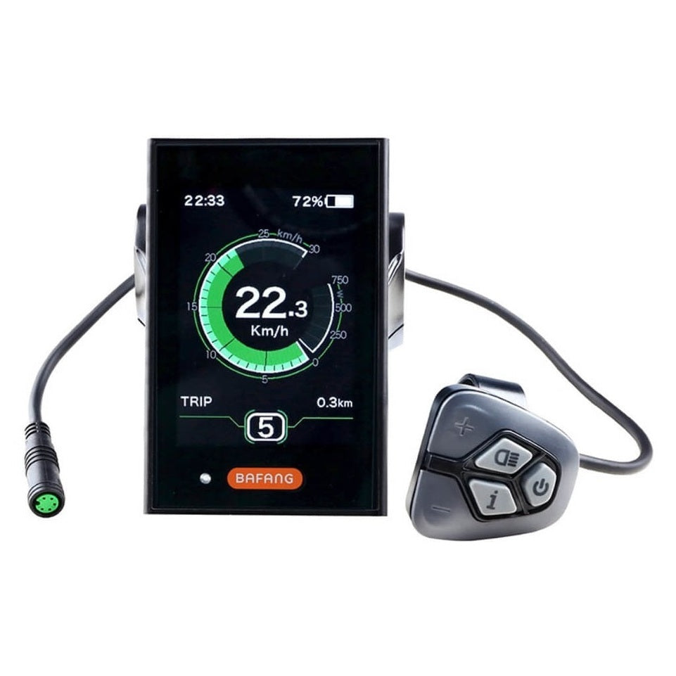 Das farbige LCD-Display zeigt alle wichtigen Informationen wie Geschwindigkeit, Akkustand, Unterstützungsstufe und Distanz auf einen Blick. Mit dem linken Bedienelement können Sie bequem zwischen den Unterstützungsstufen (3, 5 oder 9) wechseln, die Beleuchtung aktivieren oder die Schiebehilfe aktivieren – so können Sie das Rad auch beim Gehen mühelos schieben.
